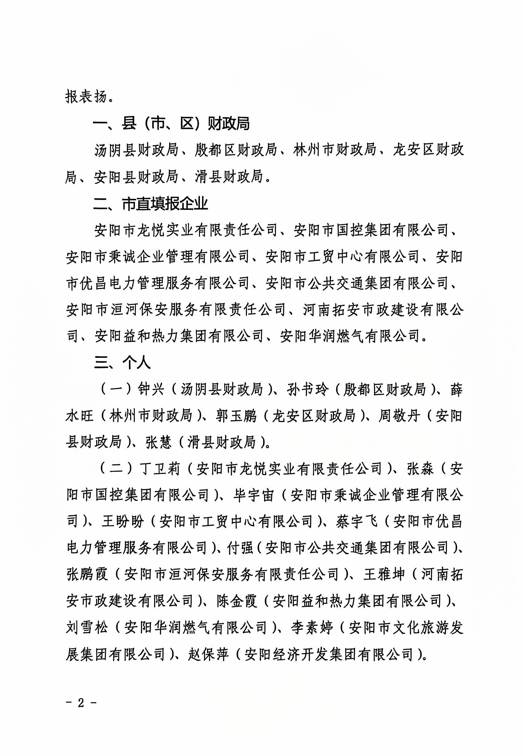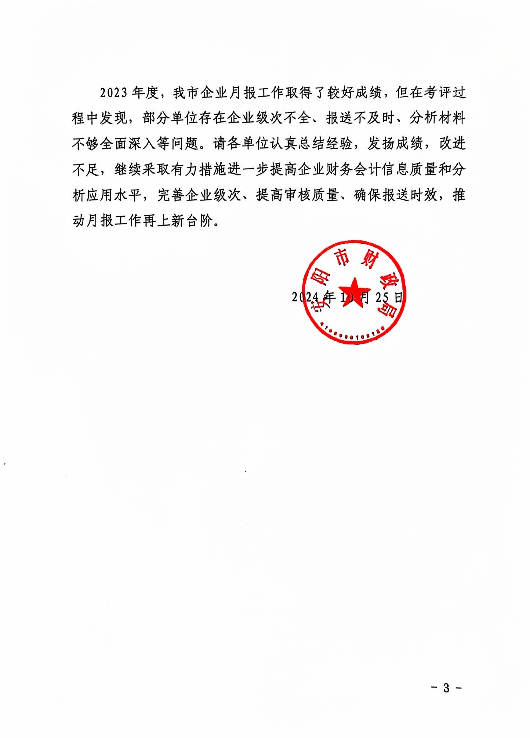 10月25日,安陽市財(cái)政局印發(fā)《關(guān)于2023年度企業(yè)經(jīng)濟(jì)效益月報(bào)工作的通報(bào)》(安財(cái)企〔2024〕5號),經(jīng)安陽市財(cái)政局綜合考評,洹河保安公司2023年度經(jīng)濟(jì)效益月報(bào)工作及財(cái)務(wù)部副主任張鵬霞同志,被通報(bào)表揚(yáng)。