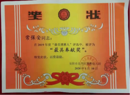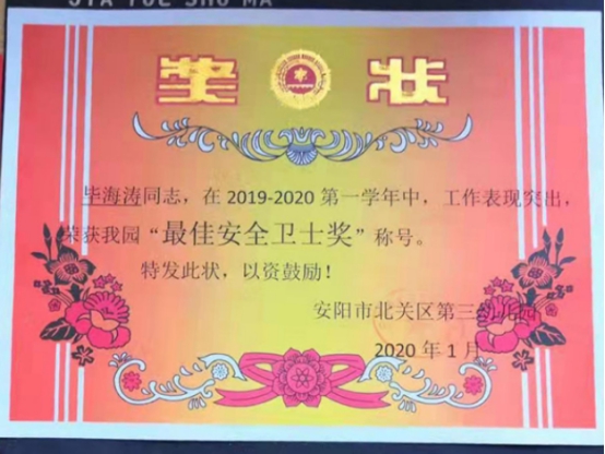 獲獎(jiǎng)隊(duì)員中,駐北關(guān)區(qū)區(qū)直幼兒園張強(qiáng)在2019年度“不忘初心 花開綻放 美麗北幼人”評選活動(dòng)中,榮獲“美麗奉獻(xiàn)獎(jiǎng)”;駐北關(guān)區(qū)博雅幼兒園常保安在“美麗博雅人”評選中,被評為“杰出奉獻(xiàn)獎(jiǎng)”;駐北關(guān)區(qū)第三幼兒園畢海濤榮獲“杰出安全衛(wèi)士獎(jiǎng)”稱號(hào)。自該大隊(duì)擔(dān)負(fù)北關(guān)區(qū)教育系統(tǒng)安全保衛(wèi)工作以來,駐各小學(xué)、幼兒園保安員夯實(shí)保安技能,開展應(yīng)急處置預(yù)案演練,認(rèn)真履行職責(zé),為創(chuàng)建平安校園做出了突出貢獻(xiàn)。