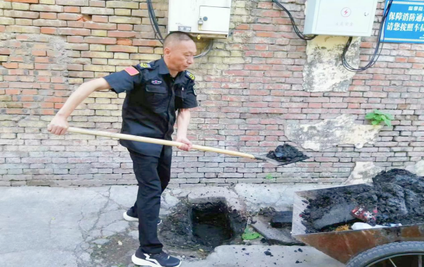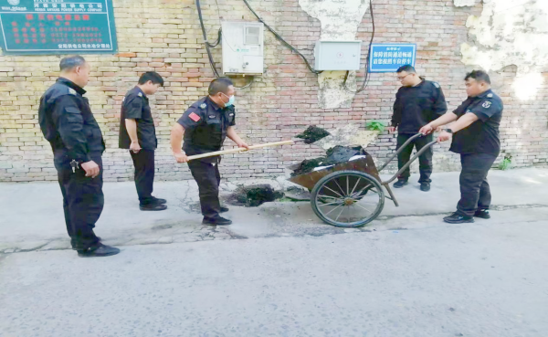 董偉得知情況后,立即組織隊員趕往現(xiàn)場進(jìn)行查看,經(jīng)排查發(fā)現(xiàn)污水外溢是由后院下水道沉淀池堵塞,造成營業(yè)廳污水難以排放。為徹底整治下水道堵塞這一“頑疾”,董偉安排水冶本地隊員從家里拿來鐵揪、手推車等工具,組織隊員對沉淀池進(jìn)行徹底清理。當(dāng)翻開沉淀池窨井蓋時,面對臭氣熏天的淤泥,隊員們沒有絲毫的退縮,頂著刺鼻的氣味,大家一起動手,將堵塞的淤泥、樹葉、生活垃圾等集中用推車清運(yùn)拉走。下水道疏通后,隊員又提水把周圍污染的路面清洗干凈。下水道通了,路面也干凈了,大家的心情也舒暢了。