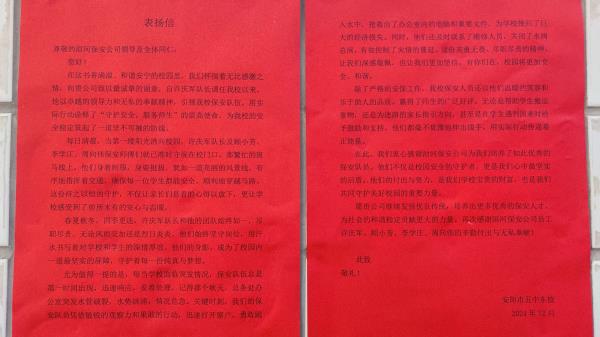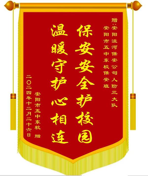 12月27日上午10時許,安陽市五中東校有關(guān)領(lǐng)導(dǎo)專程將一面寫有“保安安全護(hù)校園 溫暖守護(hù)心相連”的錦旗和一紙表揚(yáng)信送到公司,感謝公司人防三大隊(duì)派駐學(xué)校保安班一直以來對維護(hù)校園平安所作出的辛勤努力和付出,營造了安全、有序、文明、和諧的環(huán)境,為構(gòu)筑平安和諧校園作出了重要貢獻(xiàn)。