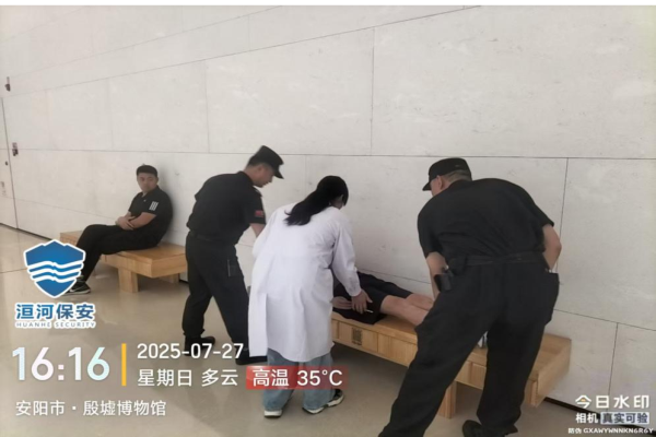 7月27日15:40,殷墟博物館特保大隊(duì)隊(duì)員王德?tīng)?zhēng)與李亞偉在二樓日常巡邏時(shí),發(fā)現(xiàn)一名五十多歲男游客面色異常,二人立即上前關(guān)切詢問(wèn),游客自述頭暈不適。王德?tīng)?zhēng)第一時(shí)間通過(guò)對(duì)講機(jī)聯(lián)系一樓當(dāng)班班長(zhǎng)王巖。王巖迅速響應(yīng),立即帶領(lǐng)醫(yī)護(hù)人員趕赴二樓現(xiàn)場(chǎng)。醫(yī)護(hù)人員到場(chǎng)后,當(dāng)即為游客測(cè)量血壓,發(fā)現(xiàn)其血壓高至170,經(jīng)進(jìn)一步細(xì)致檢查,確認(rèn)游客可能因低血糖導(dǎo)致,讓游客口服水果糖緩解,暫無(wú)緊急危險(xiǎn)。處置期間,王德?tīng)?zhēng)、李亞偉負(fù)責(zé)維護(hù)現(xiàn)場(chǎng)秩序,為救助工作的順利開(kāi)展提供保障。隨后,王巖聯(lián)系到游客家屬。待家屬趕到后,特保隊(duì)員小心護(hù)送游客至東門(mén)出口,并貼心叮囑家屬陪同游客前往就近醫(yī)院做進(jìn)一步檢查。