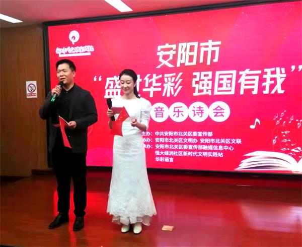 2021年10月17日下午,安陽(yáng)市“盛世華彩 強(qiáng)國(guó)有我”音樂(lè)詩(shī)會(huì)在恒大綠洲社區(qū)新時(shí)代文明實(shí)踐站二樓宣講中心隆重舉行。安陽(yáng)市總工會(huì)宣教部部長(zhǎng)、市職工作家協(xié)會(huì)主席、市作家協(xié)會(huì)副主席、市文聯(lián)兼職副主席張艾敏觀看表演。公司培訓(xùn)中心王曉丹同臺(tái)獻(xiàn)藝。